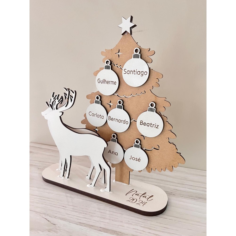 Árvore Natal em mdf craft e branco, com renas e bolas personalizadas com nome