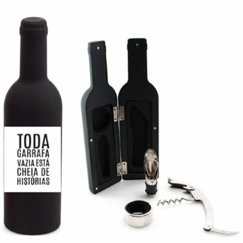Original conjunto para vinhos em forma de garrafa com suave toque exterior, fecho magnético e acessórios em aço inox. Iclui saca-rolhas com corta-cápsulas, tampa doseadora e recolhe gotas.